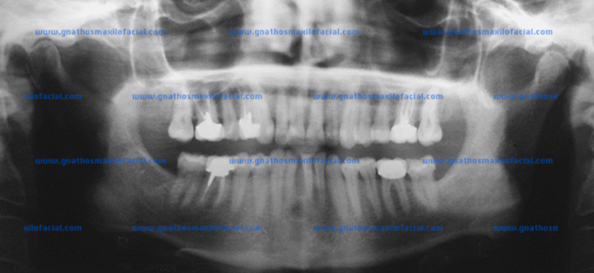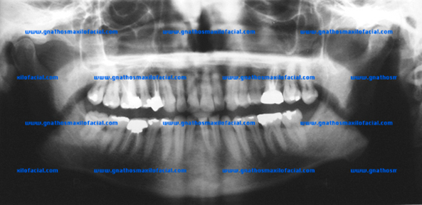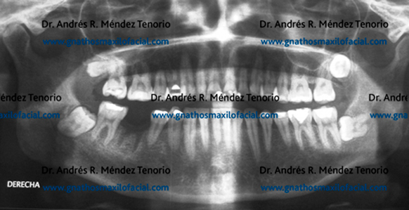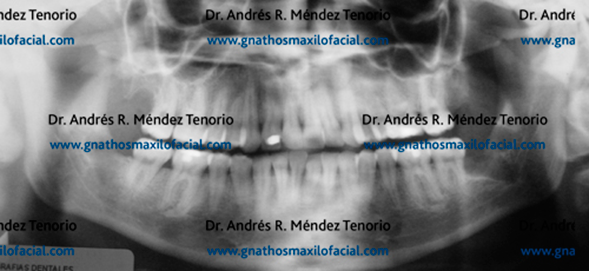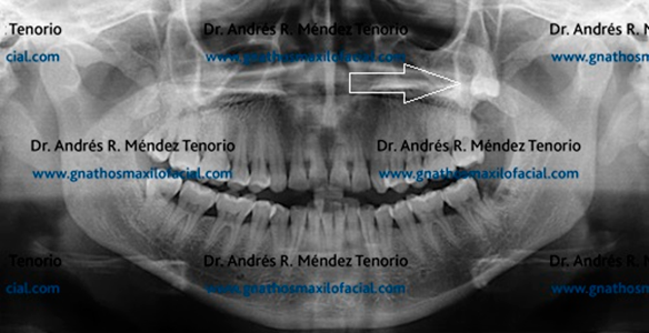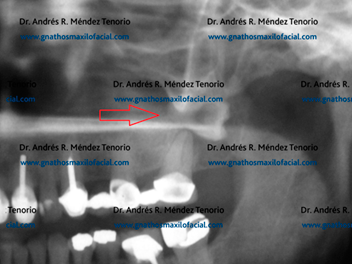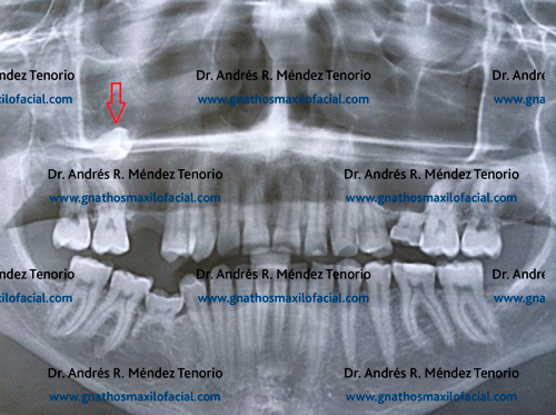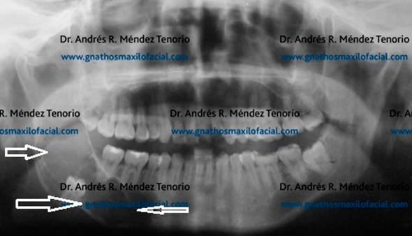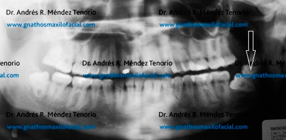| Radiografia panorámica mostrando 3os molares. Del lado izquierdo (flecha) ante la ausencia del inferior, el 3er molar superior se ha salido de su plano y lastima la mucosa de la mandíbula |