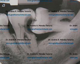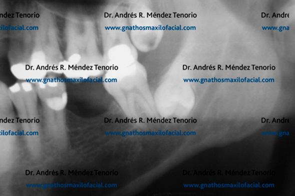 | 3er molar inferior izquierdo semierupcionado e impactado contra el 2o molar adyacente, que ha producido caries profunda y pérdida de este último. | |