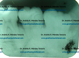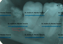 | Instrumento fracturado en los tejidos blandos (flecha), cercano a la zona de extracción de un 3er molar inferior izquierdo |