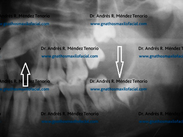 | Quiste dentígero relacionado a la corona de un tercer molar inferior izquierdo retenido. Arriba también hay otro quiste relacionado al canino (flechas) |