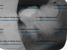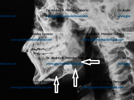 | Misma lesión (flechas) en una rx lateral oblícua de mandíbula |