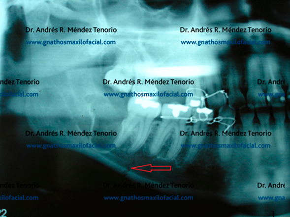 | Fractura mandibular (flecha) durante la extracción de un 3er molar inferior derecho. |